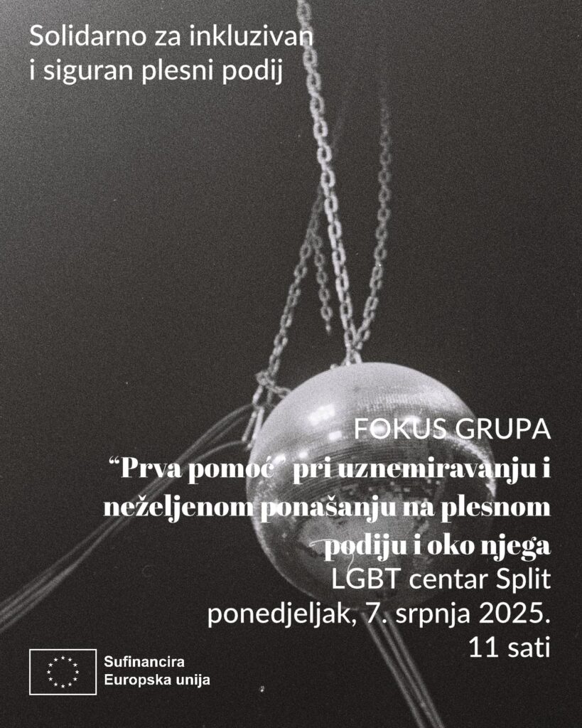 Ako si mlada osoba koja izlazi i vjeruje da klubovi mogu biti sigurnija i inkluzivna mjesta pridruži se razgovoru na temu “prve pomoći” u neželjenim situacijama. Razgovor se održava u ponedjeljak, 7. srpnja u 11 sati u LGBT centru Split.