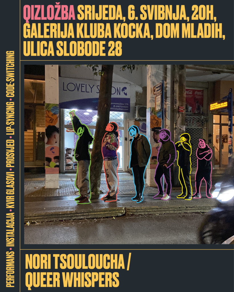 Queer Whispers je performans i instalacija o simbolici korištenja našeg glasa sa svrhom da kao manjinska skupina zauzmemo prostor. Queer glas nosi duboko značenje i složenu povijest, bilo da se radi o prosvjedu na ulici, skandiranju, lip-syncing-u, code-switching-u, prisvajanju govora mržnje ili partijanju. Ukorijenjen u queer teoriji, životnom iskustvu i kontinuiranom istraživanju queer tijela u neprijateljskim javnim prostorima, performans stvara interaktivni ritual queer šaputanja pretvorenog u viku. Performans koristi glas u njegovom punom rasponu kako bi ispunio zvučni krajolik.Donosi značenja prisvjanja, tuge i osnaživanja. Ponavljanjem, riječi gube svoj fiksni kontekst i značenje, transformirajući se u svoj fonetski profil i opipljive zvučne valove koji obuhvaćaju svaki dio prostora.