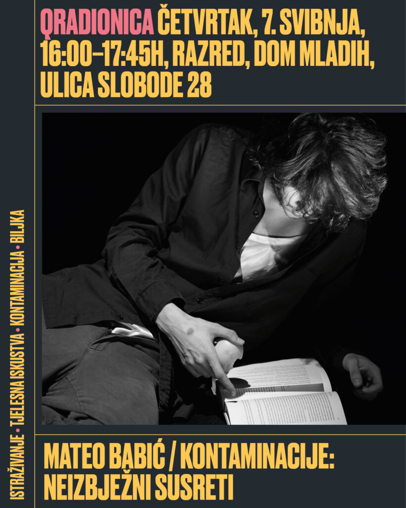 Kako ona utječe na naše tijelo i percepciju? Može li kontaminacija biti i prostor susreta, promjene ili potencijala? Naglasak je na istraživanju, otvorenosti i radu unutar vlastitih granica. Sudjelovanje je aktivno, ali prilagodljivo svakome.