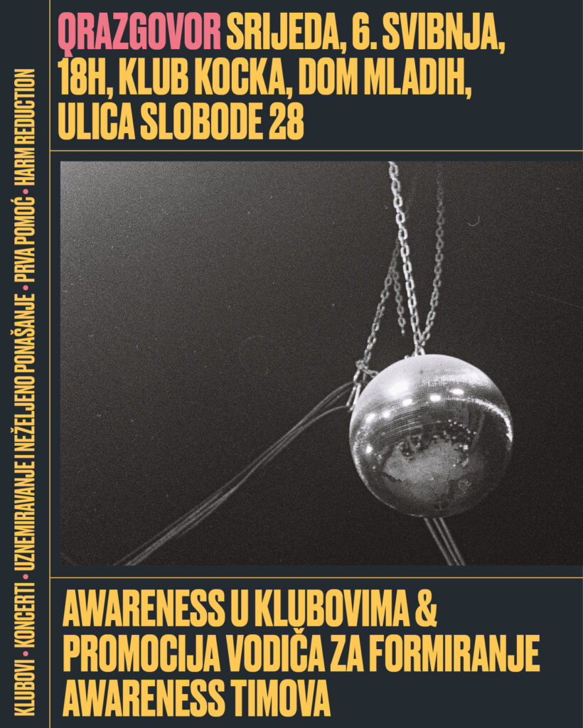 Ovaj susret ujedno je i poziv na uključivanje – sudionici_ce će imati priliku pridružiti se awareness timu koji će biti prisutan na nadolazećem ZVJERINJAKU u Klubu Kocka (petak, 8. svibnja)
